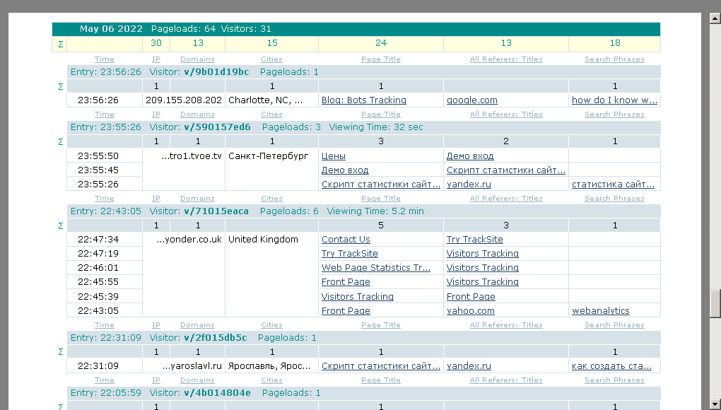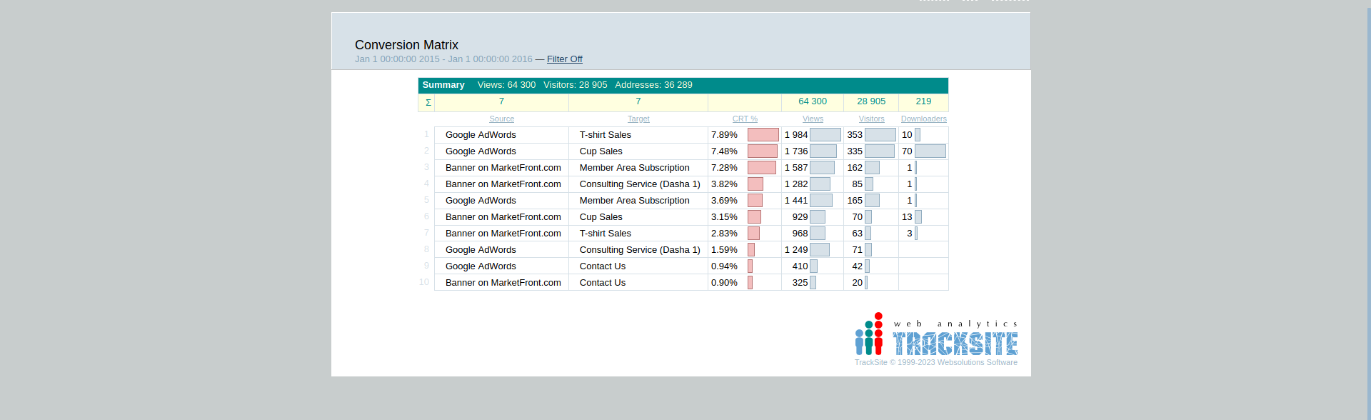 In particular, TrackSite Analytics allows tracking statistics of conversion (rates, ROI etc.) for sources such as online advertising campaigns, landing pages, content items, online business segments, arbitrary sources of visitors, sources of online customers acquisition, including conversion analytics for all types of referrers such as: