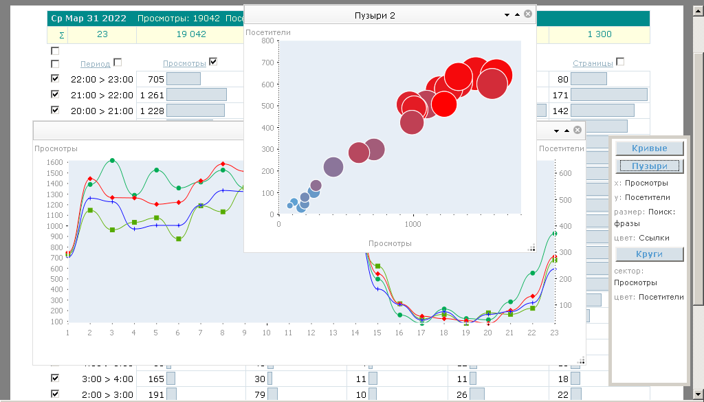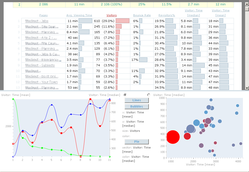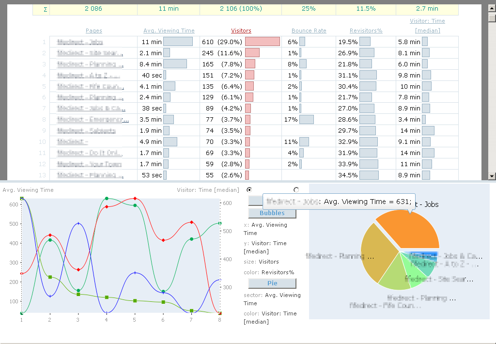 Compare anything to anything, add or omit data, focus on key indicators/statistics and key business segments. On a single page each report can selectively present multiple performance indicators, selected by user from up to 64 indicators, so that analyst can see complete picture represented by combination of indicators, see correlations of multiple time series (e.g. see that growth in number visitors is attributed to growing search traffic, etc.).