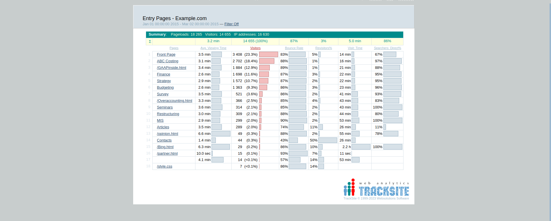 TrackSite report that presents aggregate distribution of website's impressions accross website's pages and over audience of website's visitors, i.e. an overall impression delivered to audience. It is important that this TrackSite's report confirms proper exposure of key information message of your website to its audience, which is main aim and overall measure of website's success.
