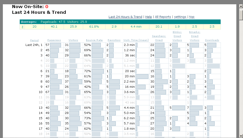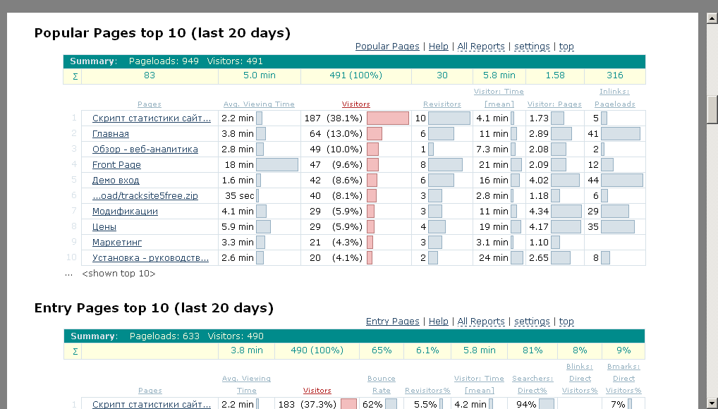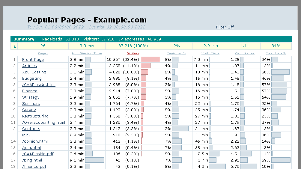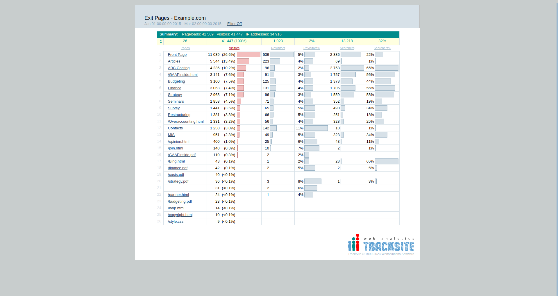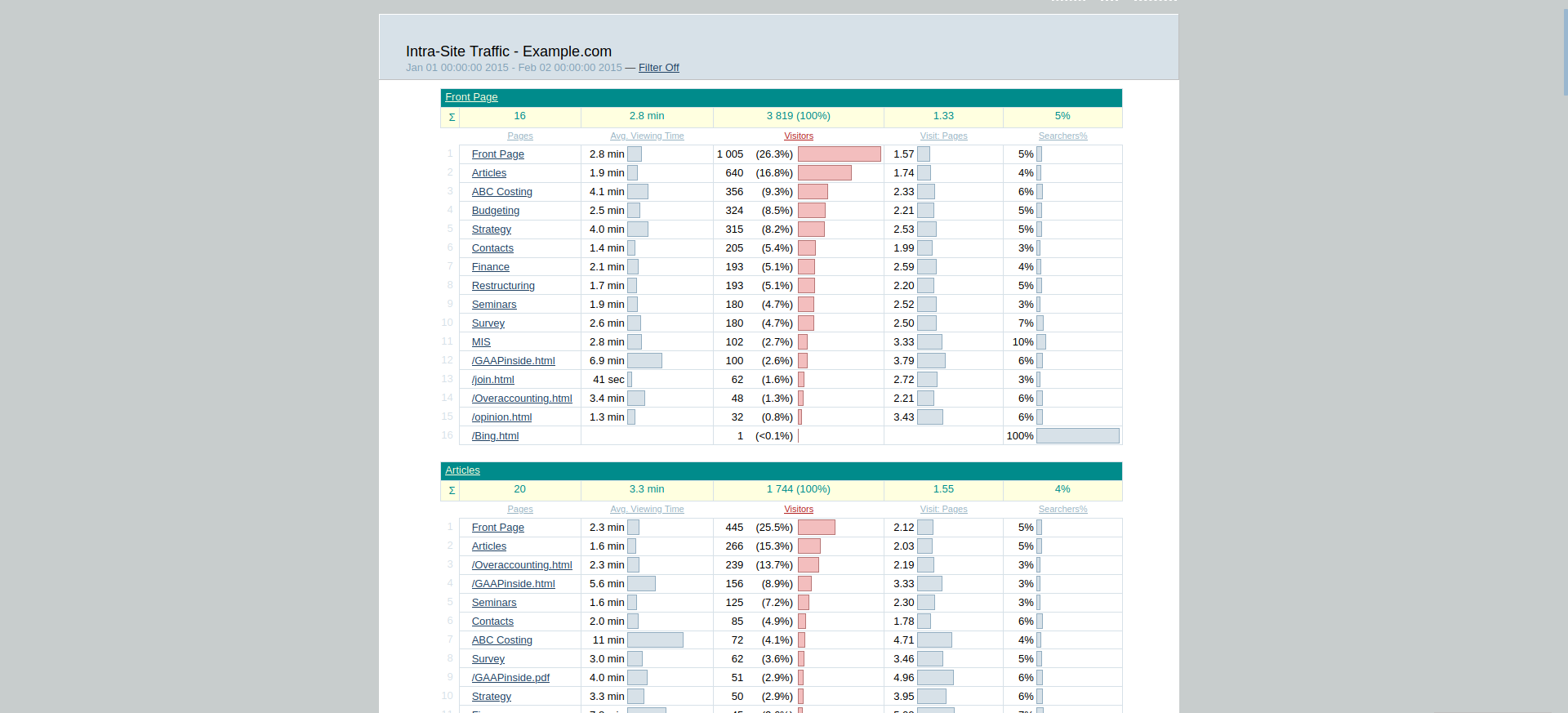 Website is a set of pages that visitor navigates through to access information. Accordingly, TrackSite Analytics reflects (aggregate or not) interaction of audience of website's visitors with that website using set of reports that analyze exposure and intra-site traffic flows, which in turn are determined by, and thus can be used to assess, major factors of website's design and marketing: partitioning of website's content into pages, design of navigation hyperlinks that connect pages of website with each other and interests of audience brought to site as a result of marketing efforts. TrackSite Analytics offers rich set of reports and statistics/metrics needed to assess exposure and intra-site traffic flows:
