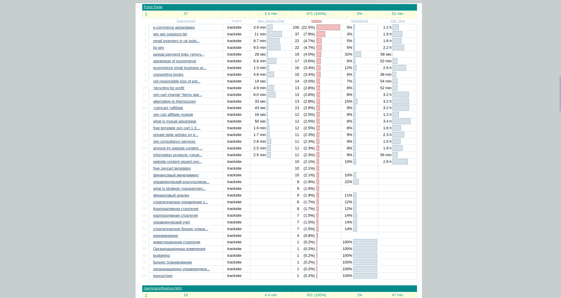 Post-click-analysis of on-site behavior of searchers (i.e. visitors who find site via search engines) is of fundamental importance, without it SEO and advertising in search results may be totally ineffective and even useless. PPC campaigns and ranking high in search engine results for specific search keywords will bring visitors to your site, but this alone not neccessarily means these visitors will convert, buy or even not leave immediately. Instead of click-trough-rate or SERP-rank the true measures of search marketing effectiveness are conversions and revenues/profit received from those searching visitors. Using search phrases analytics of TrackSite you can concentrate on the high-converting and/or high-earning search terms that you can buy PPC advertising for and/or optimize your website for to move pages of your website to the search results on a search engine results page (SERP) 1 where over 80% of search activity happens and boost traffic from those invaluable search keywords, while not wasting your time and budget on low-value non-converting non-profitable search terms. Use TrackSite to measure, focus, optimze and earn.