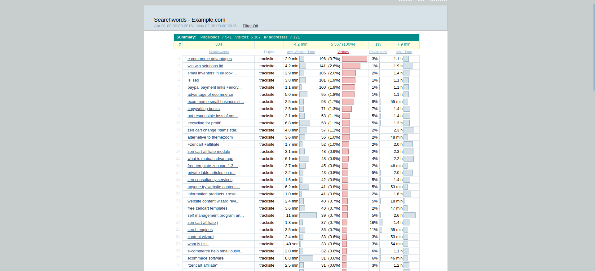 Include search phrase filters and statistics of searches, search phrases and searching visitors into time-series reports of TrackSite to analyze performance trends of different search phrases and semantic groupings of phrases, different landing pages (search attractors), different geograpic areas, etc.