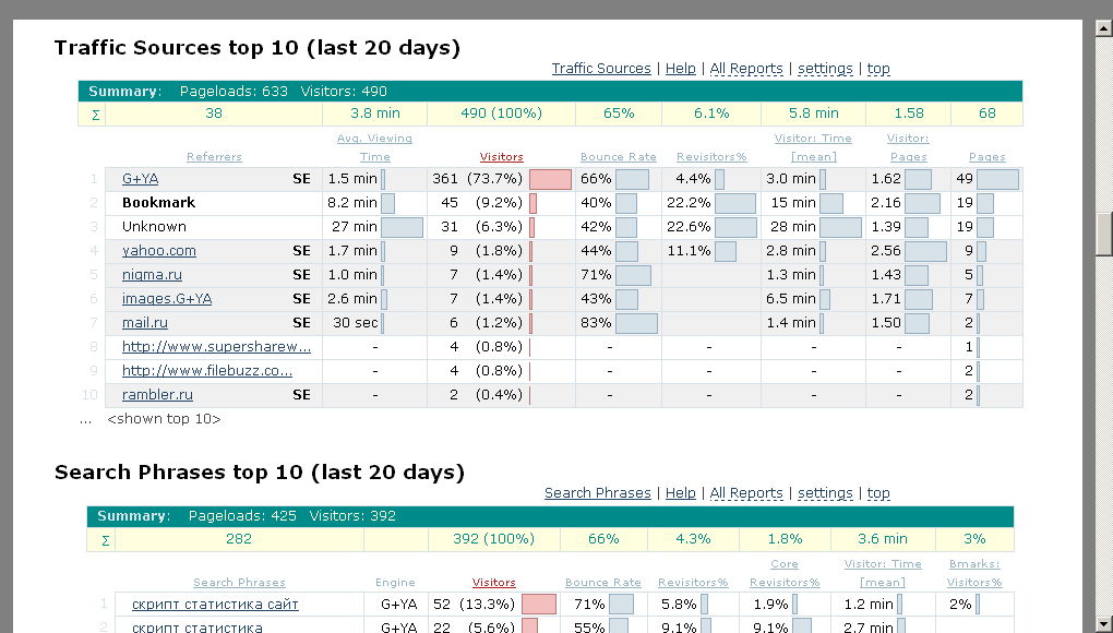 TrackSite Analytics is highly flexible tool that allows you to customize analytics in many ways. For example, on next screenshot "G+YA" designates created by an analyst custom aggregated statistics for Google and Yandex search engines together: