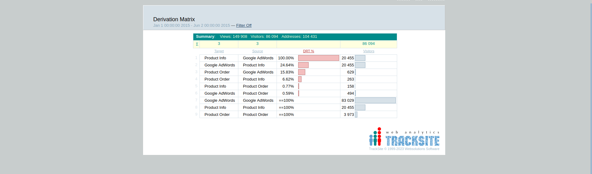 Alternative web analytics tools that require every conversion target to be planned and configured upfront, e.g. weeks, before that target accumulates enough data to answer analyst's question makes conversion analytics prohibitively costly and forces you to analyze inadequately small number of the most obvious conversion targets (usually, only main, monetary conversions, such as checkout). But in reality website has multitude of conversion sources and conversion targets that are crucially important for understanding behaviour of website visitors and optimization of online business, and that are completely ignored as a result. In contrast, using TrackSite allows conversion rates for arbitrary conversion sources and targets, even those that have never been thought of before, to be measured immediately for testing hypothesis or answering various "what if ...?" questions in order to better understand behaviour of visitors and/or customers of online business.