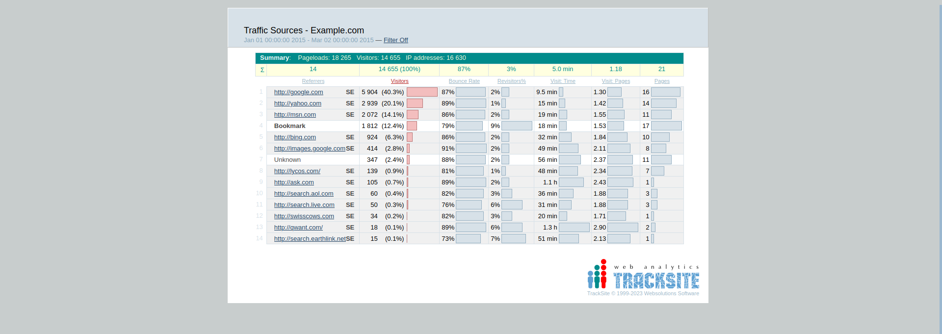 - TrackSite web analytics data ownership and control. TrackSite in-house web analytics software can collect years of valuable insider data, such as business metrics and data about visitors and customers. This invaluable data is under your full control, kept inside your organization, always readily available and not exposed to "surprises" of third-party services.