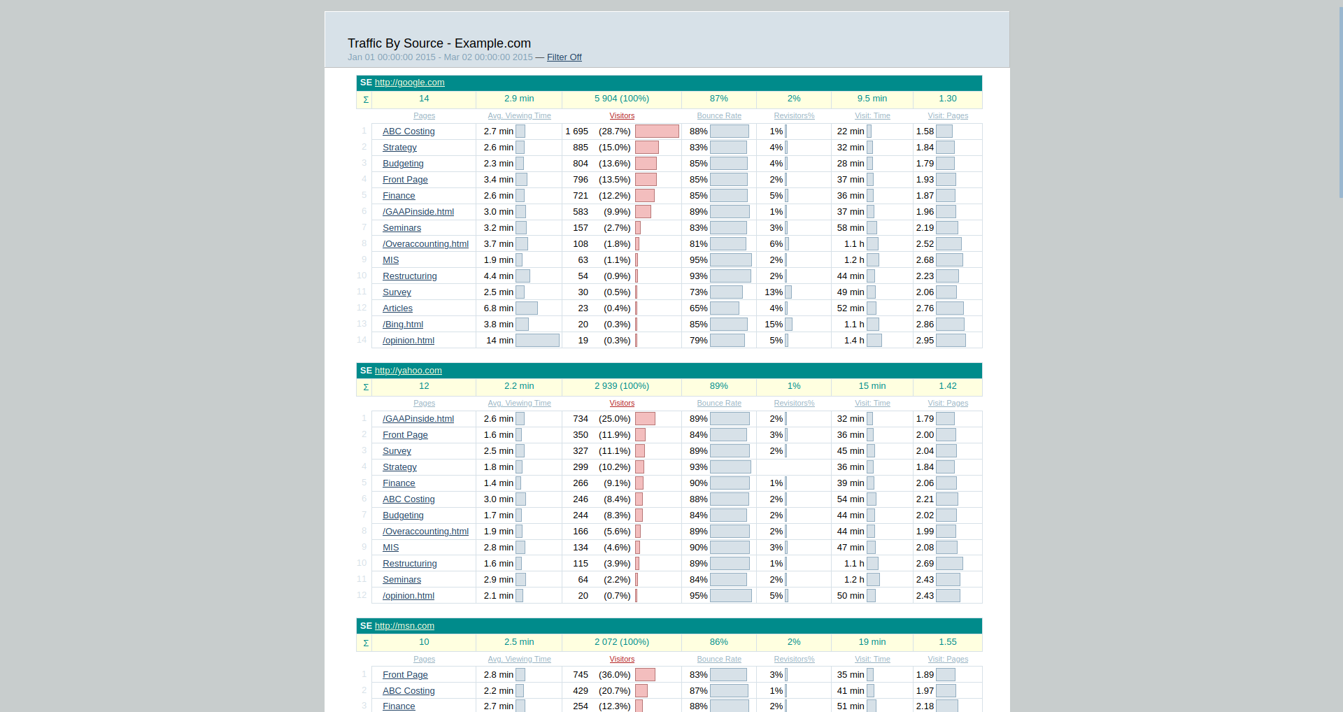 Complete web analytics of on-website activity of visitors who were brought by specific source is reported separately for different sources (referrers), which allows to compare effectiveness of different sources.