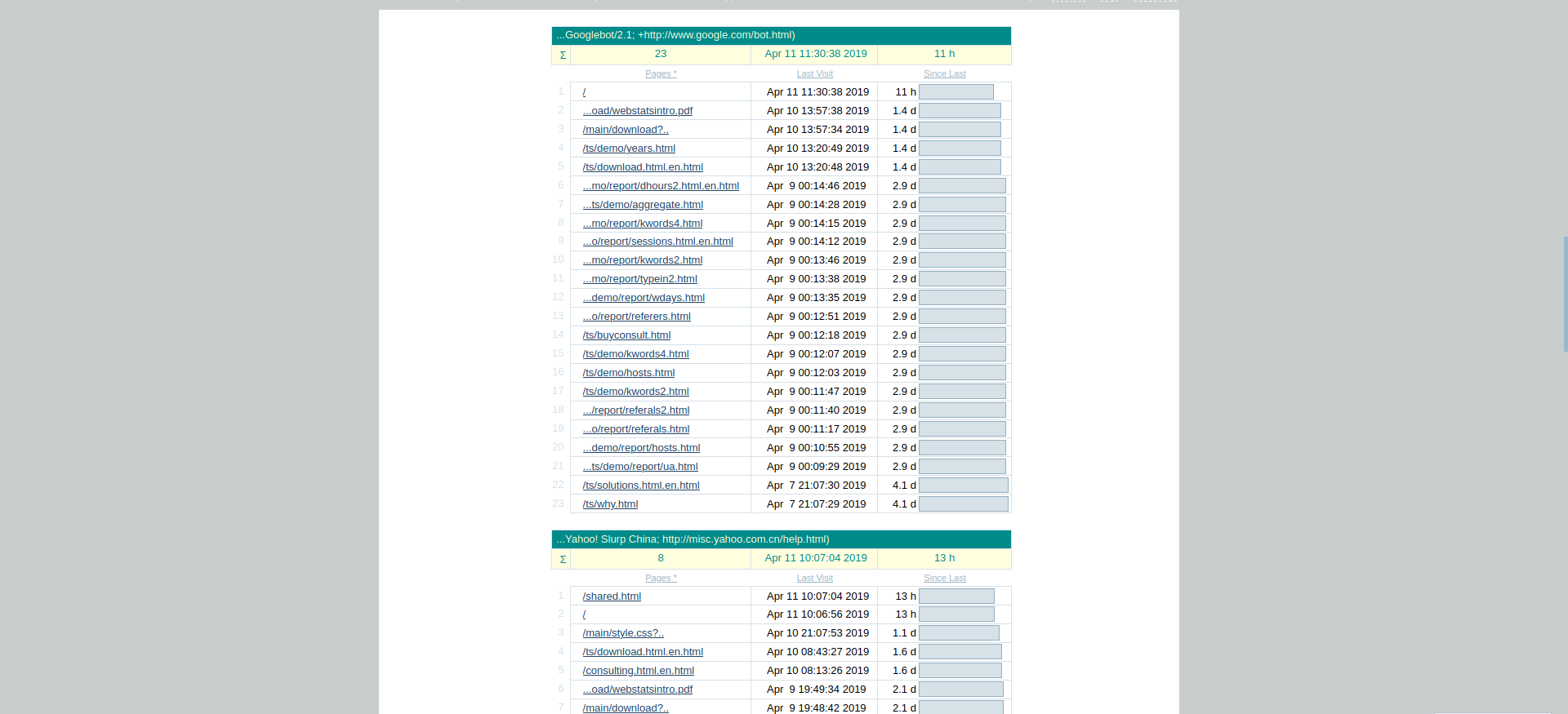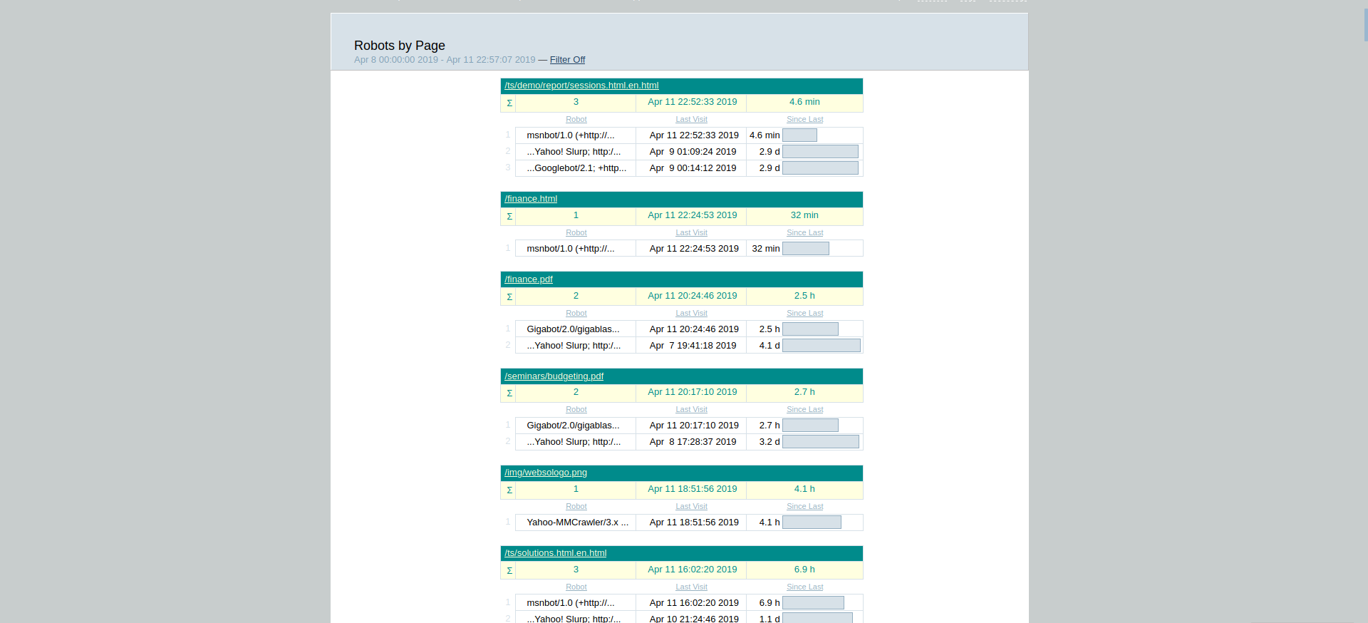 In case TrackSite is co-hosted on your website or TrackSite Pages is used to implement your website, TrackSite Analytics allows you to track when specific page or file of your site has been indexed by specific search engine crawler (or fetched by any other bot), how frequently it gets revisited and re-indexed, and perform search engine optimization (SEO) accordingly. Crawlers of search engines and other bots are tracked and reported per URL and per bot/crawler.