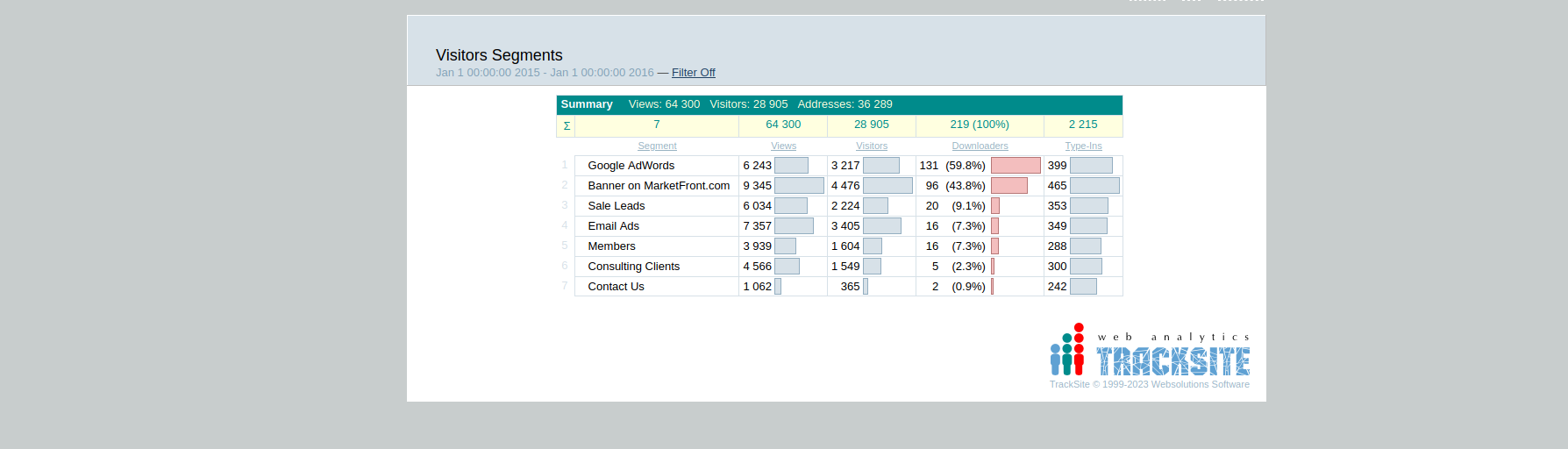 With special Visitors Segments report TrackSite can render metrics for each of multiple different segments simultaneously to compare segment performance side by side and rank segments.