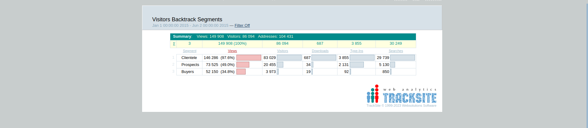Similar or even more sophisticated web analytics can be selectively applied to visitors, prospects, leads and buyers coming from specific referral source (ads, backlinks, etc.) or specific landing page or those who have viewed specific page (e.g. product or discount announcement), etc. And these are just a few of countless analytical opportunities offered by TrackSite's advanced segmentation capabilities.