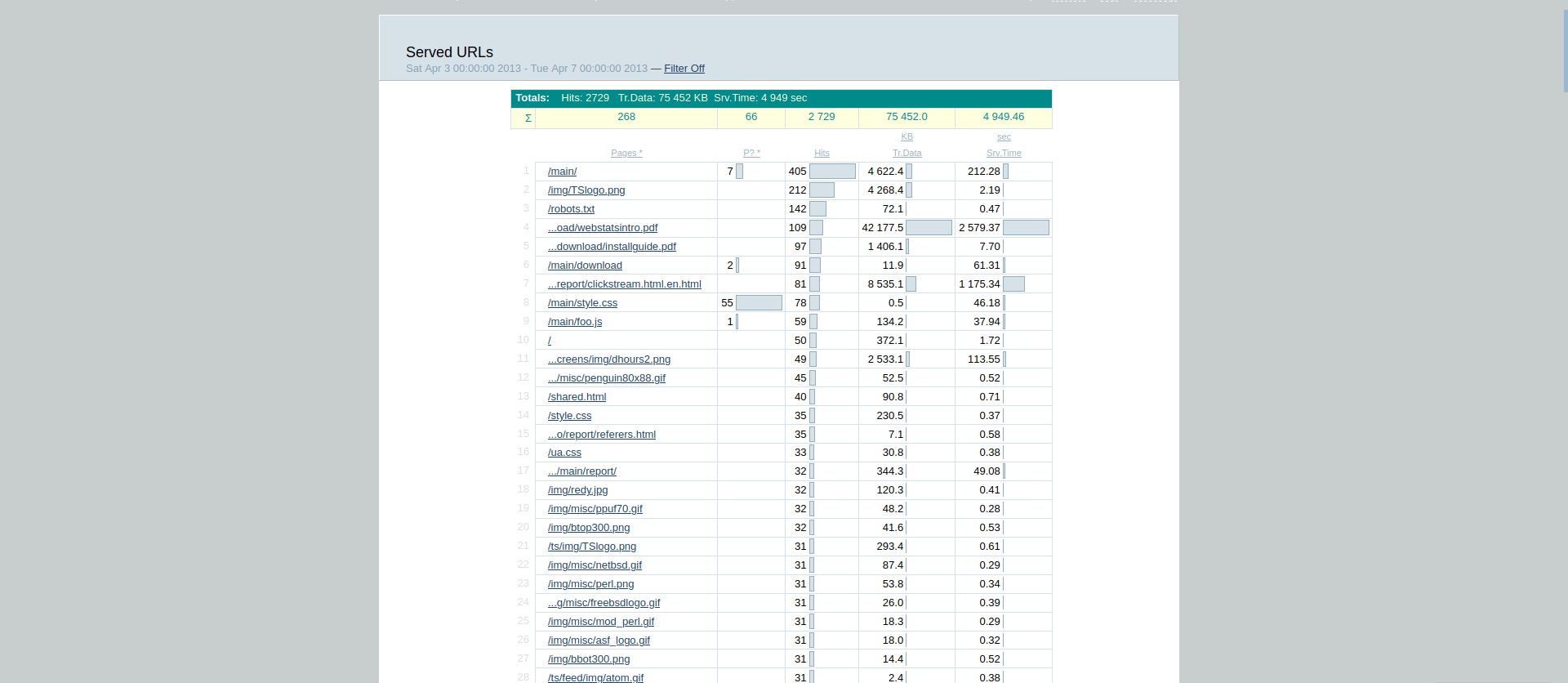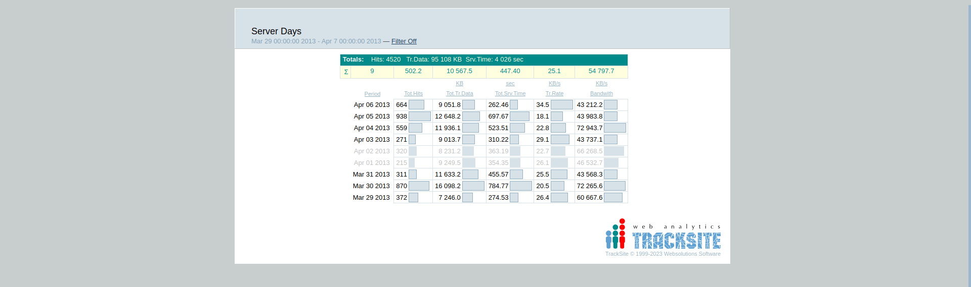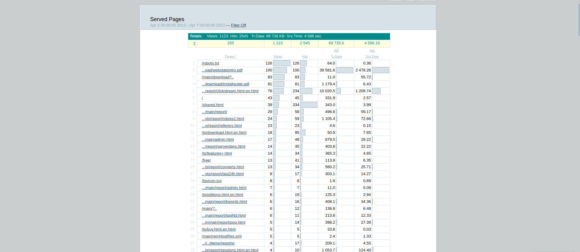 In case TrackSite is co-hosted on your website or TrackSite Pages is used to implement your website, TrackSite Analytics allows you to track metrics of web server that runs your website, including: number of hits served, HTTP response codes, data transfer volumes, transfer rates, connection bandwidth, total web server time spent on each page or file, etc. These stats are reported both aggregately for entire website as well as per page and per URL. In addition, using TrackSite the site maintenance team can monitor "404 Not Found" and alike errors, spot broken links, detect abnormal webserver activity, optimize web server performance and bandwidth utilization, etc.
